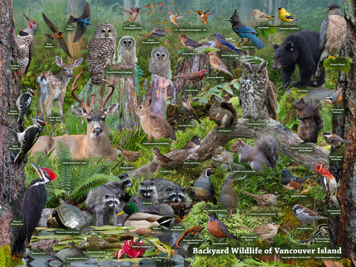 Backyard Wildlife of Vancouver Island 11" x 17" Placemat.   These 11”x 17” Heavy duty laminated placemats have become our top seller.  Great for the dinner table, desktop, coffee table or even on the wall.  They have proven to be an excellent and handy tool to use while educating customers in the store as well. This placemat showcases the Backyard Wildlife of Vancouver Island.     A great way to learn the birds and animals that visit your backyard.
