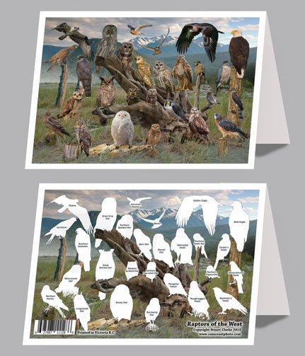 They come individually packaged with a hanger for easy display on sales rack or slatwall. This card features the Raptors of the West. These images have been captured over the last ten years of shooting across North America. They have been digitally cutout and artistically placed with similar species on these colorful cards. With a handy checklist on the back they are a great way to keep track of the species you have seen and make for an excellent companion to the poster or placemat.