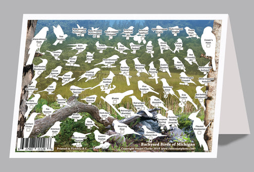 They come individually packaged with a hanger for easy display on sales rack or slatwall. This card features many of the species you would encounter in the backyards of Michigan. This card is a great identification tool for the more common backyard and feeder birds found in your state.   An excellent way to learn the birds that visit your backyard feeders.     On this card you will learn many of your local sparrows, finches, woodpeckers, blackbirds, waxwings, crossbills, hawks and swallows, along with the more colorful species like cardinals, bluejays, grosbeaks, bluebirds and thrushes.   These images have been captured over the last ten years of shooting across North America.  They have been digitally cutout and artistically placed with similar species on these colorful cards. With a handy checklist om the back they are a great way to keep track of the species you have seen and make for an excellent companion to the poster or placemat.
